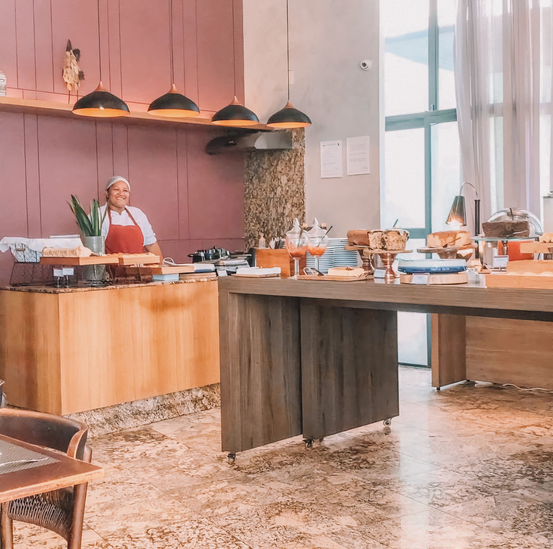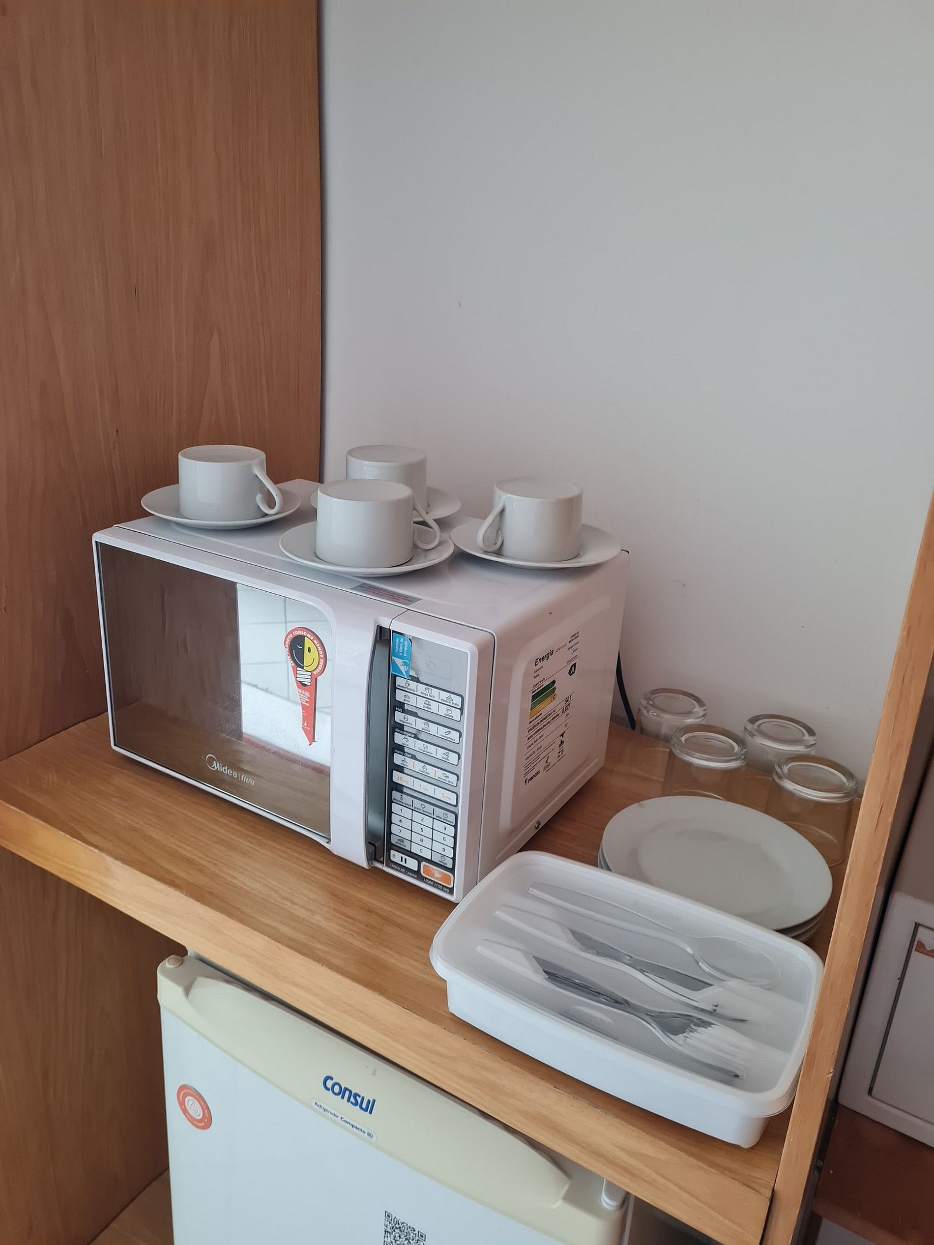 Não temos cozinha mas a suíte é equipada com Frigobar, micro-ondas, sanduicheira, liquidificador, cafeteira e utensílios básicos de cozinha para tornar sua estadia mais aconchegante.