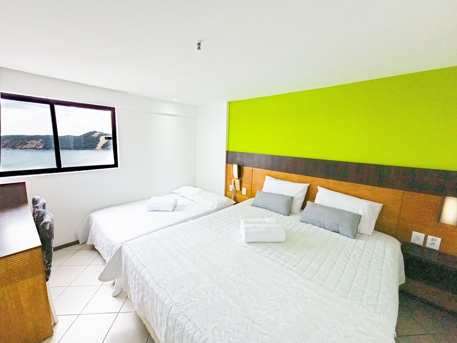A janela da suíte possui uma vista deslumbrante para o Morro do Careca e para o mar de Ponta Negra.