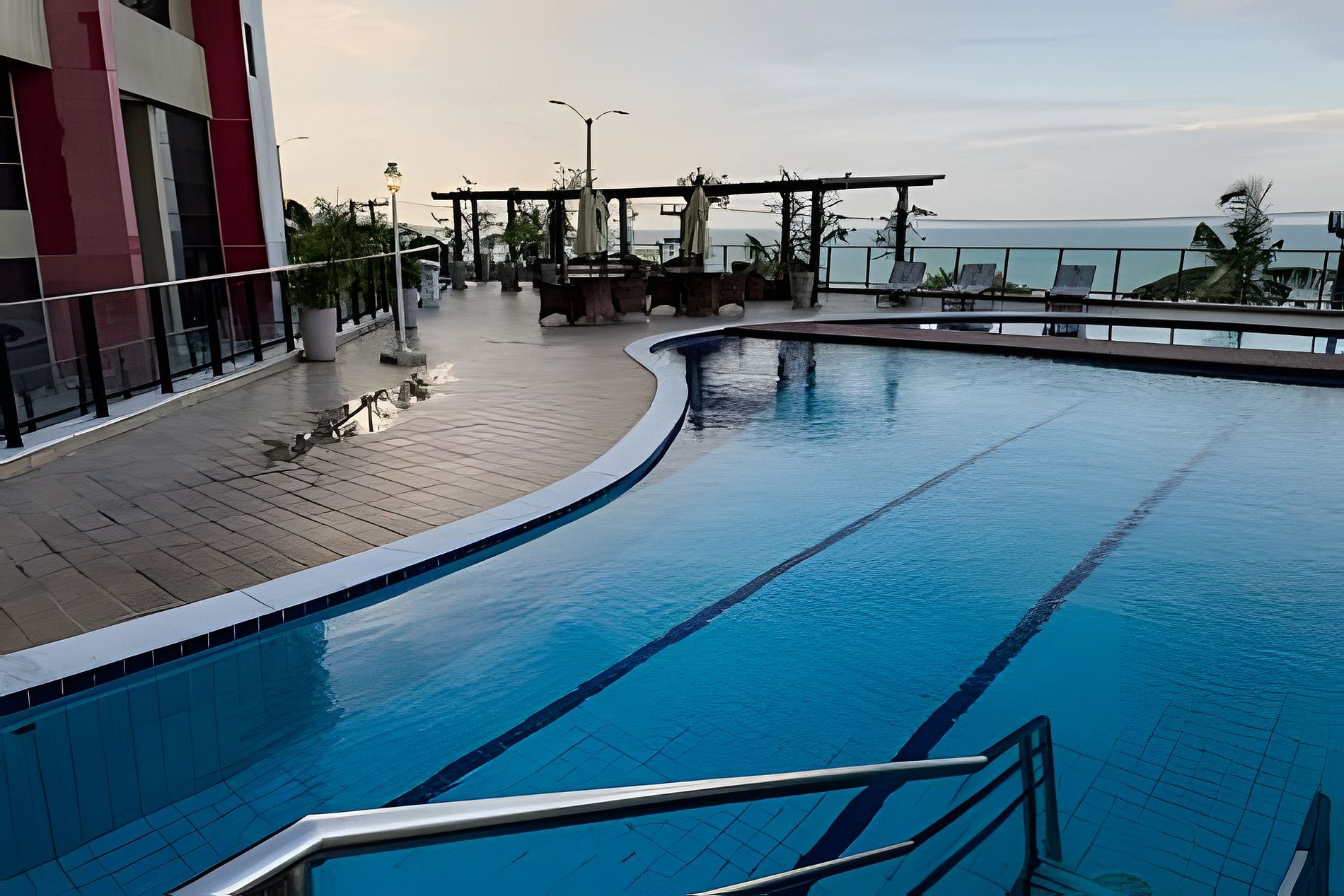 - Piscina com deck e vista para o mar, localizada em área elevada com espreguiçadeiras disponíveis para os hóspedes.